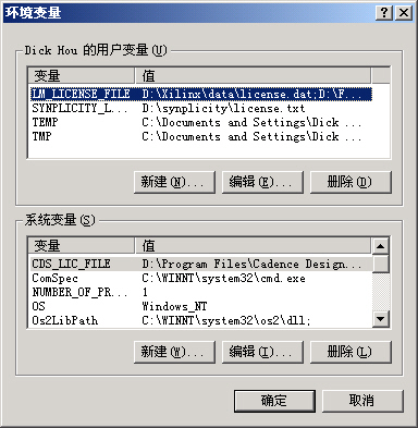 列在上面的是用户变量,下面的是环境变量,建议在用户变量栏设置较好。栏内有两项,一项是变量,一项是值。可以看到它只是将win98下的格式中的set 和 =去掉了,其它并没有不同:在变量栏中填入变量名称,如LM_LICENSE_FILE、SYNPLICITY_LICENSE_FILE,再在值一栏中输入完整路径和license文件名就搞定了!如果EDA软件在安装时没有生成设置变量栏,则可以点击新建按钮,按照上述格式输入就行了。 WINXP中打开环境变量的顺序有点不一样,斑竹也忘了,请网友自行尝试。 最后需要注意的是,授权文件一般包含几项重要信息,如服务器名(例如该机作服务器,其它客户机运行该机上的软件)、主机号、网卡号、硬盘卷标号、密钥等,所以千万不要去改动license文件,因为license文件中的密钥是根据前面几项机器特征(一般情况下上述特征都是唯一的)中的一种算出来的,如果改动后有可能使密钥对不上而使软件无法运行。如果你的license有时间限制,则你不能改动系统时钟(往前改可以,但不能往后改,即不能让时间倒退),否则会使license失效。在这种情况下你只有格式化硬盘了!另外如果你的license是按磁盘卷标产生的,则不能格式化C盘。   |